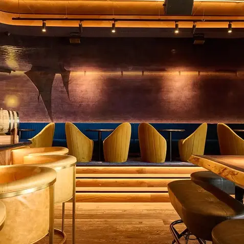 The Focal Bar: Designed as the heart of the venue, the bar features an impressive stone counter and architectural shelving. It acts as a "behavioural anchor," drawing guests in and serving as a high-energy central gathering spot.